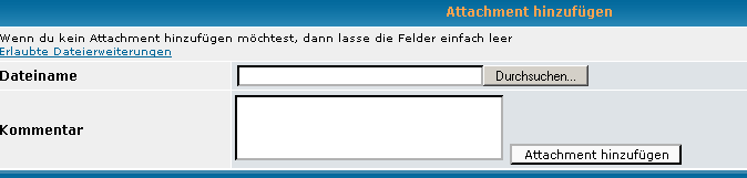 Diese Funktion erlaubt es den Besuchern des Forums, ihren Beiträgen Bilder oder auch Dateien einem Beitrag anzuhängen.