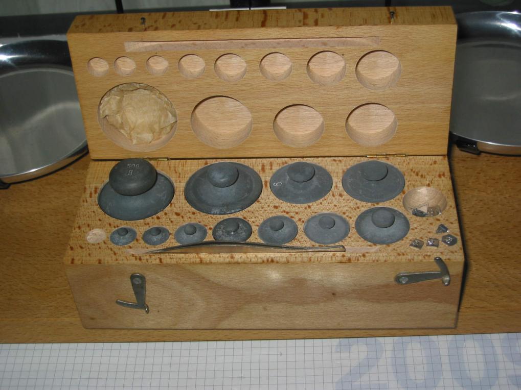 Mit dabei war noch ein Gewichtssatz 10mg - 500g in der Holzschatulle.