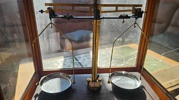 eine Feinwaage im Holzkasten
